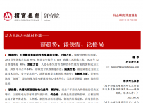 动力电池之电池材料篇:辩趋势,谈供需,论格局摘要:辩趋势:下游需求是驱动技术变革的关键。正极方面,磷酸铁锂持续回暖,2021全年装机占比超50%,相比去年提升17pct;高镍三元渐成主流,2021年12月渗透率超40%。负极方面,人造石墨凭借首效和倍率性能方面的优势成为 ...